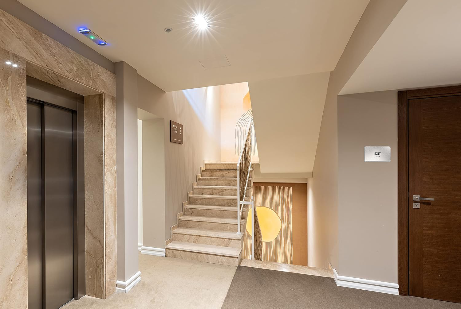The brushed silver finish combined with minimalist raised black text ensures this sign blends seamlessly into any professional or commercial setting. Perfect for offices, retail spaces, healthcare facilities, and public buildings requiring clear exit signage.